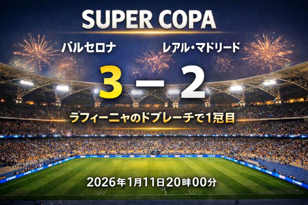 出典先:https://www.fcbarcelona.jp/ja/football/first-team/photos/4432609/3-2 ラフィーニャに始まりラフィーニャがしめる!! https://youtu.be/9V2guLT3S14?si=T099S9u41oXycD6o スーペルコパ決勝2026年1月11日(日)20:00(現地時間) @キング・ア... -