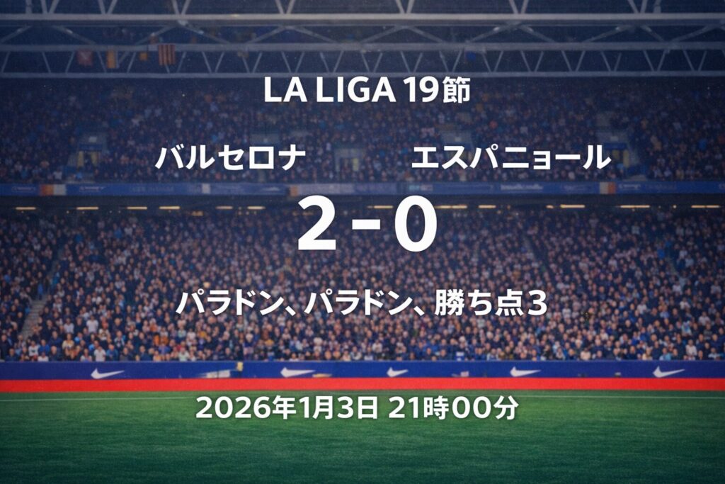 守護神が守り最後は決定力で勝ち点3 https://youtu.be/rDpz-ZzBCBs?si=ebdZCK-IDHHy6GhT ラ・リーガ第18節2026年1月3日(土)21:00(現地時間) @ステージ・フロント・スタジアム観客:36,283人主審:ビクトル・ベルドゥラ FC Barcelonaエスパニョール20...