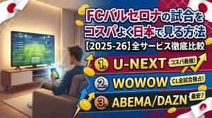 FCバルセロナの試合をコスパよく楽しむなら、目的に合わせてサービスを選ぶのがポイントです。ラ・リーガメインならU-NEXTサッカーパック(2,600円)、CLも見たいならWOWOW月額プラン(2,530円)との併用がベスト。2025-26シーズンもバルサの戦いをリアルタイムで楽しみましょう!