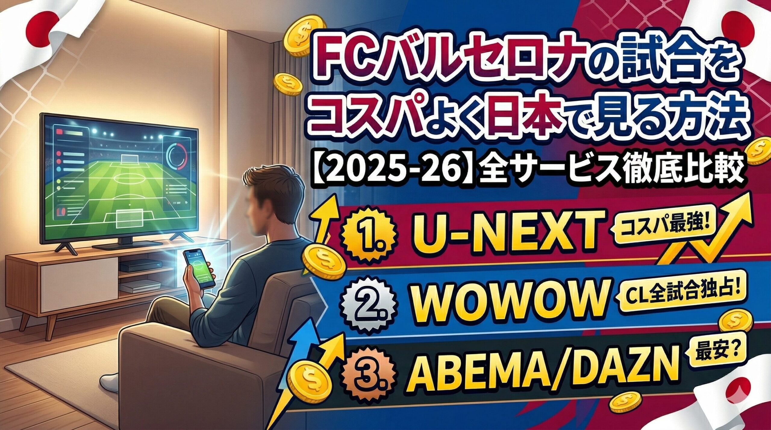 1試合も見逃したくないけれど、無駄な出費は抑えたい。そんなクレ(バルサファン)のために、2025-26シーズンの視聴サービスを徹底比較しました。