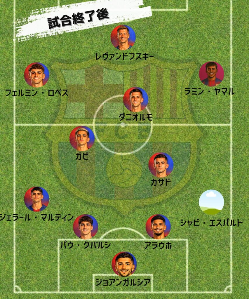 後半、バルサはペドリに代えてフェルミン・ロペスを投入し、さらなる攻勢に出ます。