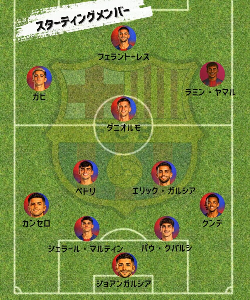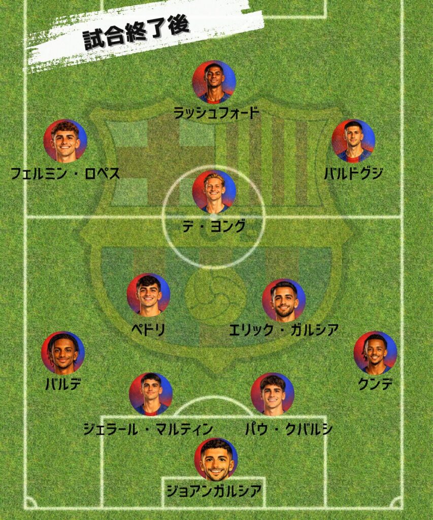 3試合連続スタメンのガビはアトレティコ戦のような躍動感は影を潜め、カンセロとヤマルは前半で相次いで負傷交代というアクシデントが重なった。56分にはフェラン・トーレスのゴールがVARでノーゴールと判定される不運も。後半から入ったバルドグジは献身的な姿勢は見せるも、試合を変えるような違いは作れなかった。