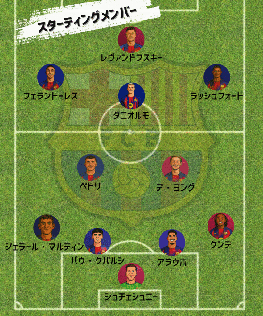 後半はジェラール・マルティンとアラウホに替えてバルデとエリック・ガルシアを投入するという、まさかの最終ライン2枚替えからスタート。試合終盤ならまだしも、後半開始早々にディフェンスラインを一気に入れ替えるのは非常に珍しい采配で、明確なテコ入れの意図が感じられました。実際、後半立ち上がりからは両センターバックが積極的にドリブルで前線まで運ぶシーンが増え、前半とは明らかに異なる攻撃的な姿勢を見せています。チーム全体としても前への意識が強まり、敵陣でボールを保持する時間が増加。セビージャのファールも目立ち始め、徐々に流れがバルサに傾き始めました。