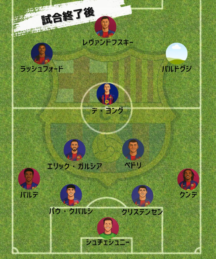 レヴァンドフスキのキレが悪く、ボールが足につかない場面も目立ち、全体的にバルサの攻撃は停滞気味でしたが、1−2で折り返せたことは最低限の結果といえるでしょう。内容としては守備の脆さと中盤の封じられ方が目立ち、後半はシステム変更や選手交代を行わないと追加点を奪われるリスクが高い展開です。それでもラッシュフォードのゴールで反撃の希望をつなげたことはポジティブな材料となりました。