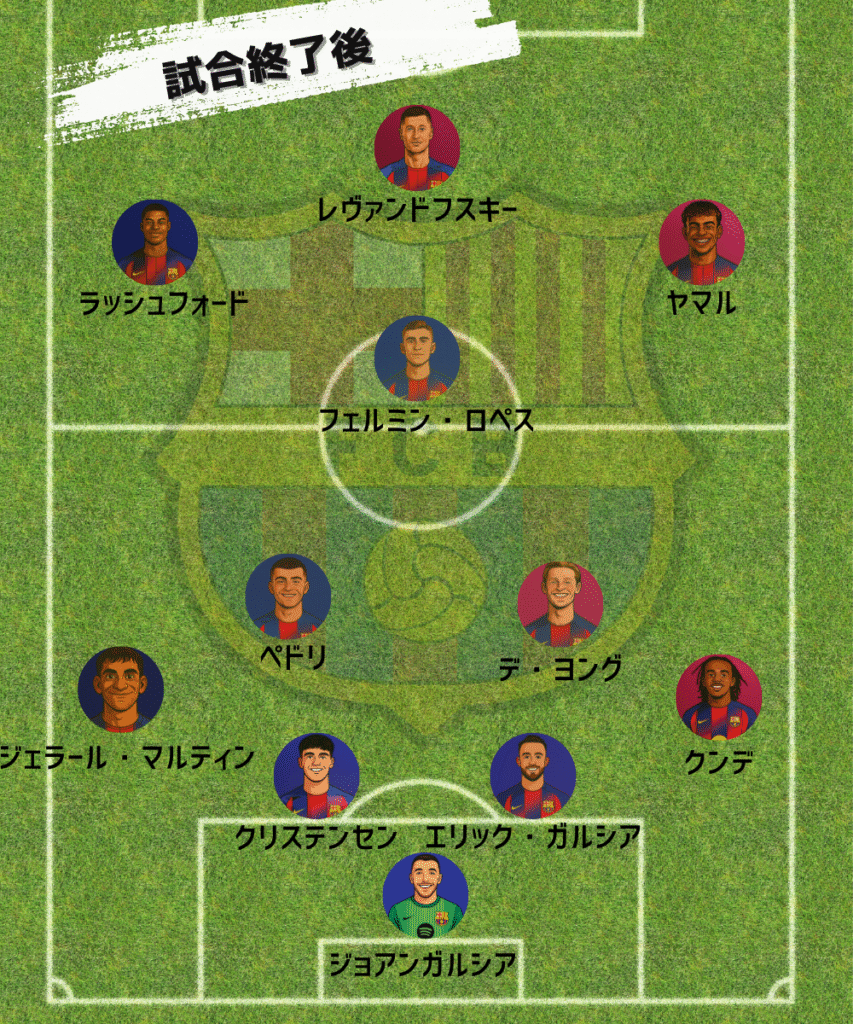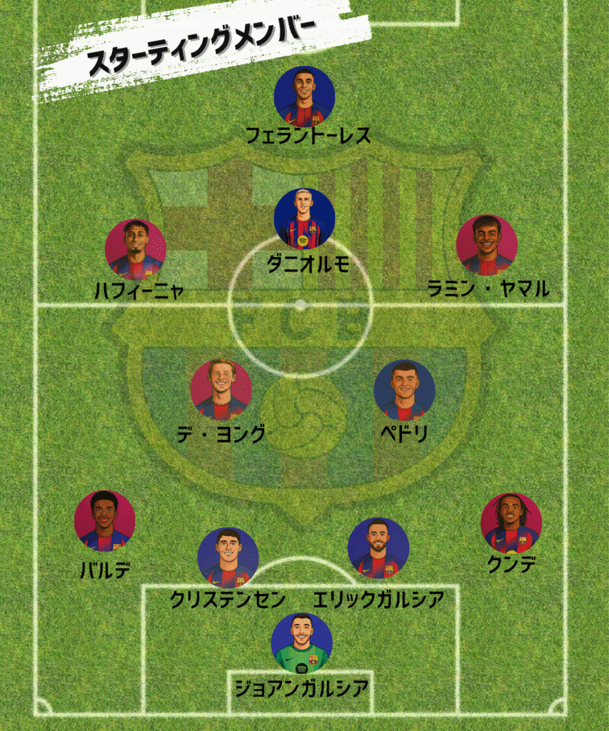 今節はアウェーながら、バルセロナは今シーズン初めてファーストユニフォームで臨んだ。スタメンはGKジョアン・ガルシア、最終ラインにクンデ、エリック・ガルシア、クリステンセン、バルデ。中盤はペドリとデ・ヨングのダブルボランチ、前線にヤマル、ダニ・オルモ、ハフィーニャ、そして1トップにフェラン・トーレスという布陣。今季初先発となったクンデ、クリステンセン、ダニ・オルモに注目が集まった。