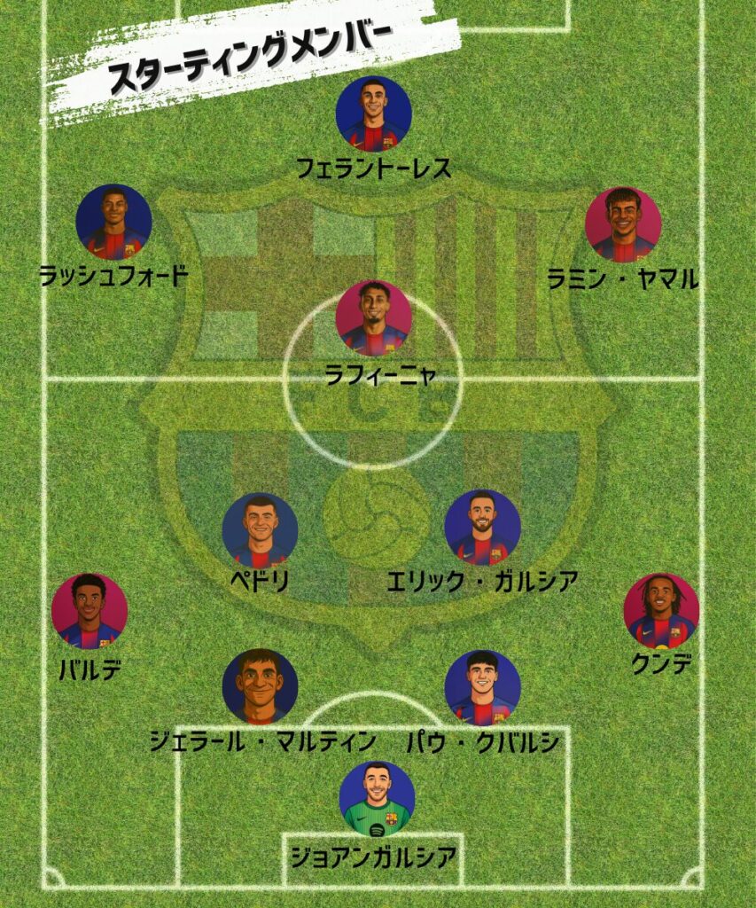 スタメンでは、直近と変わらずエリック・ガルシアがフレンキーに代わりボランチに定着。前線は左WGにラッシュフォード、トップ下にラフィーニャ、右WGにヤマル、1トップにフェラントーレスが構成し、CLで2得点を挙げたクンデの活躍にも注目が集まる。