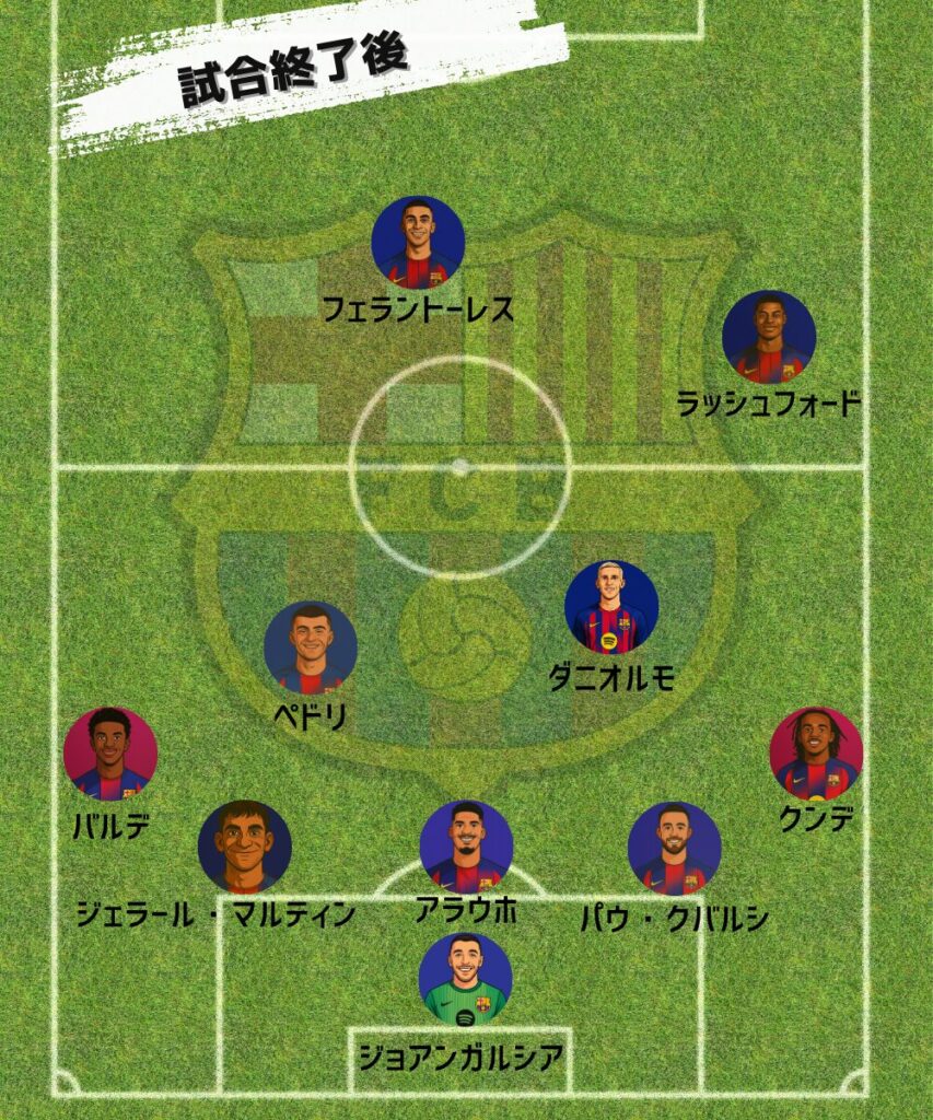 93分にはヤマルに代えてアラウホを投入。右ウイングにはラッシュフォードが入り、CLチェルシー戦以来の復帰戦となったアラウホにとっても貴重な出場機会となった。