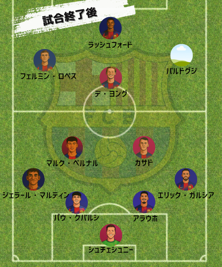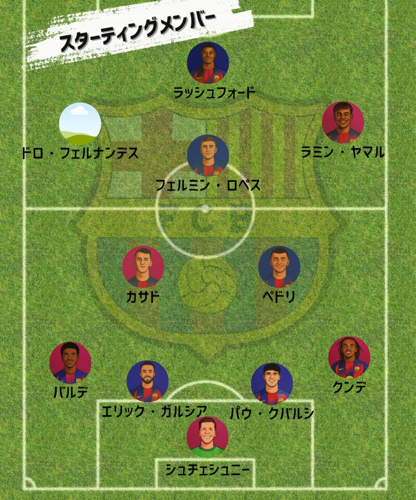 また、ヤマル・ペドリ・バルデがそろってスタメン復帰し、キャプテンマークはペドリが着用。フレンキー・デ・ヨングは温存で控えに回った。