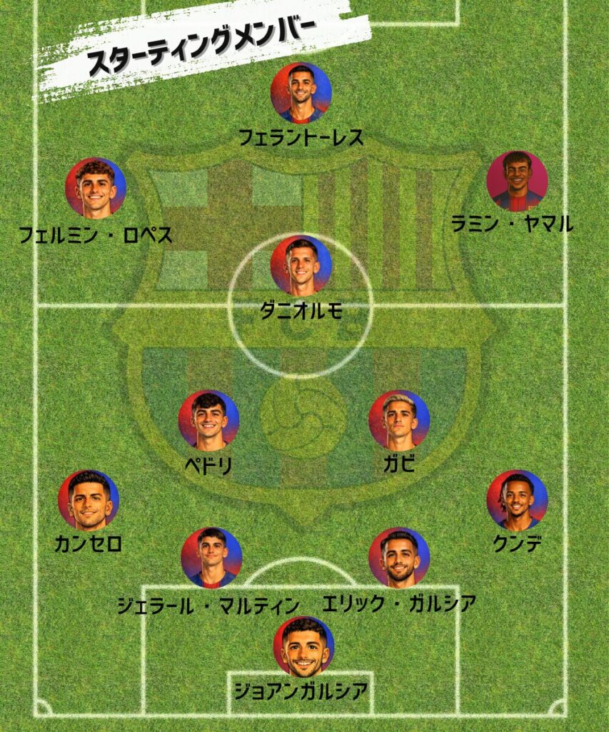 今日のスタメンは、ジョアンガルシア・クンデ・エリックガルシア・ジェラールマルティン・カンセロ・ペドリ・ガビ・ダニオルモ・ヤマル・フェルミンロペス・フェラントーレス。