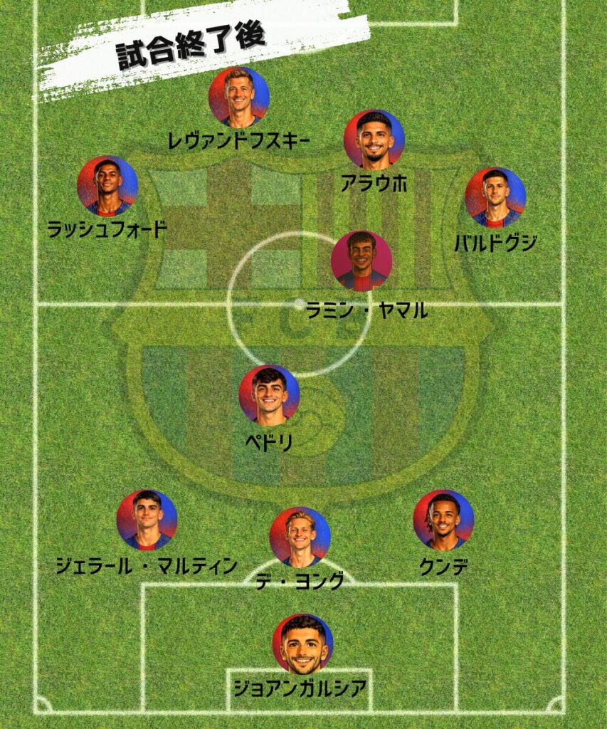 を投入。アラウホは前線に入りパワープレー要員のCFとして配置され、右サイドにはバルドグジ、ヤマルは中央へとポジションを移す。